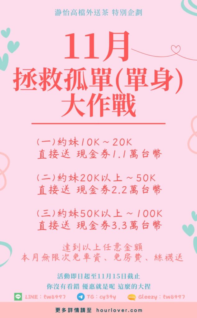 優惠福利2025年11月上旬優惠活動:拯救孤單(單身)大作戰 瀞怡 / 2025 年 11 月 4 日 活動名稱:11月拯救孤單(單身)大作戰 活動時間:2025年11月1日起至11月15日截止 活動內容: 💖約妹